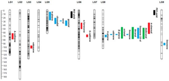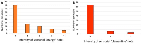 Ferrer, V.; Costantino, G.; Paymal, N.; Quinton, C.; Perdomo, E.C.; Paoli, M.; Mournet, P.; Ollitrault, P.; Tomi, F.; Luro, F. Inheritance and Quantitative Trait Loci Mapping of Aromatic Compounds from Clementine (Citrus × clementina Hort. ex Tan.) and Sweet Orange (C. × sinensis (L.) Osb.) Fruit Essential Oils. Genes 2023, 14, 1800. https://doi.org/10.3390/genes14091800