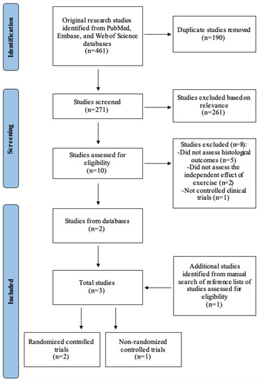 Our initial literature search yielded 461 articles. After removing duplicates and studies not meeting the inclusion criteria, two articles remained. One additional study was selected from a manual search of reference lists of retrieved manuscripts. In sum, we identified three controlled clinical trials that assessed the independent effect of exercise on liver histology in patients with biopsy-proven NAFLD (Figure 1) [5,6,7].