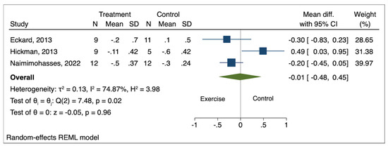 In this meta-analysis, the first to address this question to our knowledge, we found that exercise did not independently affect histological outcomes in patients with biopsy-proven NAFLD. The exercise protocols implemented in these studies were of moderate intensity, ranged from 12 to 24 weeks, consisted of 20 to 60 min sessions three to seven times per week, and included aerobic exercise, resistance training, or a combination of both. Although previous RCTs have shown that exercise independently improves serum and imaging-based markers of hepatic steatosis and fibrosis [8,9], our findings suggest that exercise alone does not significantly impact Brunt grade, NAS, or liver fibrosis. Exercise has been shown to increase insulin sensitivity, inhibit inflammatory pathways, and reduce fibrogenesis in animal models [10,11,12], but it is plausible that these effects may not directly translate to significant histopathological or clinical improvement in patients with NAFLD without additional weight reduction or dietary modification.