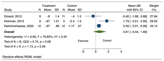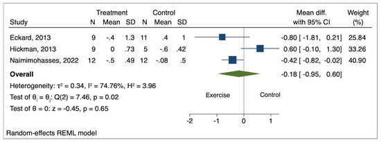 Among measured histological outcomes, Brunt grade, NAS, and liver fibrosis met the criteria for meta-analysis with data available from a minimum of three studies. The pooled effect size of exercise on Brunt grade (mean difference [MD] −0.01; 95% confidence interval [CI] −0.48 to 0.45; p = 0.96), NAS (MD 0.61; 95% CI −0.44 to 1.66; p = 0.26), and liver fibrosis (MD −0.18; 95% CI −0.95 to 0.60; p = 0.65) was not statistically significant compared to the comparison groups (Figure 2, Figure 3 and Figure 4). High heterogeneity was observed between the studies for all three histological outcomes (I2 = 75% for Brunt grade; 71% for NAS; 75% for liver fibrosis).