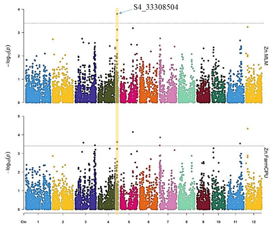 For the Zn content, the MLM model detected one SNP on chromosome 4 (S4_33308504) with a p-value = 2.41 × 10−4, while the FarmCPU model detected eight SNPs on chromosomes 3, 4, 5, 7, 11, and 12 (Figure 5 and Table 1). Among the SNPs significantly associated with the Zn content, S4_33308504 on chromosome 4 was detected by both models.