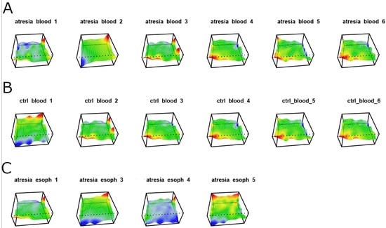 Methylome maps of individual samples were generated based on the self-organization of 946,317 CpG dinucleotides located within CpG islands. The color corresponds to the levels of methylation in CpG dinucleotide groups, with red representing high methylation, yellow and green representing intermediate methylation, and blue representing low methylation. (A) Samples isolated from the blood of individuals with EA are described as “atresia blood”. (B) Samples isolated from the blood of individuals without esophageal stenosis are described as “ctrl blood”. (C) Samples isolated from the EA esophagus are described as “atresia esoph”.