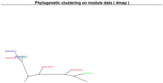 Unsupervised clustering of methylome maps presented in Figure 1 using a phylogenetic clustering by neighbor joining algorithm. Samples located closely together exhibit similar maps, while samples that are farther apart have differing maps. The respective sample groups are indicated by color: blue—samples isolated from the blood of individuals with EA are described as “atresia blood”; green—samples isolated from the blood of individuals without EA are described as “ctrl blood”; red—samples isolated from the EA esophagus are described as “atresia esoph”.