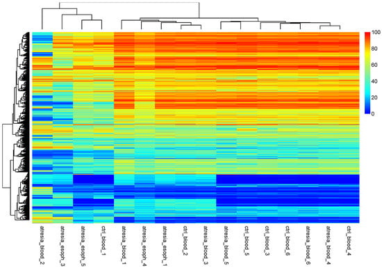 Hierarchical clustering performed at the methylation levels of individual CpG dinucleotides, excluding the X and Y chromosomes. The observation of the hierarchical tree indicates that the samples can be divided into two main groups. One smaller group consists of the samples “atresia_blood_2”, “atresia_esoph_3”, “atresia_esoph_5”, and “ctrl_blood_1”. The second group is composed of the remaining samples. A similar arrangement was obtained in the analysis presented in Figure 3.