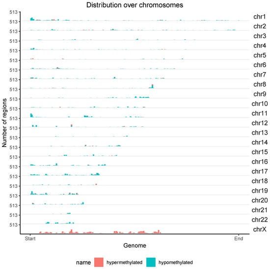 As result of the differential methylation (DM) analysis, 2056 hypermethylated and 3399 hypomethylated CpG islands were identified in individuals with EA compared to the blood methylome obtained from the control group. The majority of hypermethylated CpG islands were found in introns (451), followed by gene exons (387), gene promoters (305), and 3’ UTR sequences, which had the fewest (28). The highest number of hypomethylated islands was observed in introns (1119), followed by intergenic regions (587), gene exons (467), gene promoters (228), and 3’ UTR sequences, which had the fewest (125). Figure 6 depicts the chromosomal localization of 5455 CpG islands exhibiting significantly different methylation patterns in individuals with EA. The majority of hypermethylated islands were located on the X chromosome, while the majority of hypomethylated islands were located on autosomes.