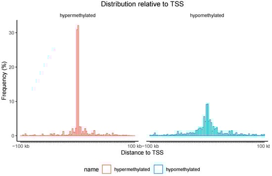 Additionally, the localization of hypermethylated CpG island regions and hypomethylated CpG island regions associated with genes relative to the transcription start site (TSS) was assessed. As shown in Figure 7, nearly 60% of hypermethylation events were found in proximity to the TSS.