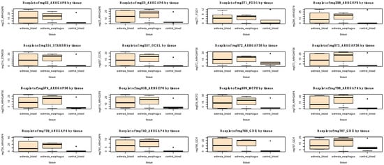 Boxplots representing methylation levels of 16 significantly hypermethylated regions (in blood of individuals with EA in comparison to blood of control group) located in 10 Rho GTPase pathway genes. In addition, methylation levels in esophageal tissues are also depicted.