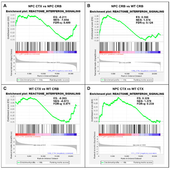 By contrast, further analysis of interferon differences between the cerebral cortex and cerebellum using GSEA of the reactome interferon signaling gene set (Figure 1) showed no differences between the cerebral cortex and cerebellum, as defined by an FDR-q < 0.25, both in Npc1−/− (Figure 1A; FDR-q = 0.409) and wildtype (Figure 1C; FDR-q = 0.871) mice. However, Npc1−/− mice showed a significant increase in interferon signaling versus wildtype controls in the cerebellum, (FDR-q = 0.124; Figure 1B and reference [8]) and, to a more modest extent, in the cerebral cortex (Figure 1D; FDR-q = 0.239).