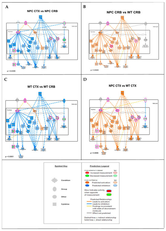 These findings are consistent with the functional analyses described in Supplementary Figures S1 and S2, showing significant differences in IFN pathway regulation between the cerebral cortex of Npc1−/− mice and those of wildtype controls. Next, we carried out further IPA functional analysis comparisons of the brain regions and genotypes that might unveil differences in these pathways that would not be observed by GSEA, which ranks the genes within a set based on differential expression, generating an enrichment score that indicates whether the genes are clustered towards the beginning or end of the ranked list, without providing information on how those genes interact within biological pathways. As shown in Figure 2, while the cerebellum presents higher activation levels of the IFN-γ and IFN-α pathways in Npc1−/− mice than wildtype controls (Figure 2B; NPC CRB vs. WT CRB), as we have previously described [8], the cerebral cortex presents lower levels of these pathways than in the cerebellum in Npc1−/− mice (Figure 2A; NPC CTX vs. NPC CRB), leading to predicted lower levels of T-cell recruitment, microglial activation, and microglial survival (Figure 2A). Interestingly, this difference in pathway activation is mirrored in wildtype mice (Figure 2C), and IFN-linked signaling is higher in both tissues in the Npc1−/− brain versus wildtype controls (Figure 2B,D).