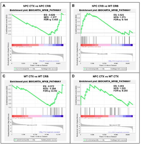 Gene set enrichment analysis of the Biocarta NF-kB pathway. Gene set enrichment analysis of the NF-kB signaling pathway shows no significant difference between tissues both in Npc1−/− mice and wildtype controls (A,C). Genotype comparison within tissues, on the other hand, shows that the NF-kB pathway gene set is significantly enriched in the cerebellum of Npc1−/− mice (B) but not in the cerebral cortex (D), compared to wildtype controls. ES = enrichment score; NES = normalized enrichment score; FDR-q = false discovery rate q value.