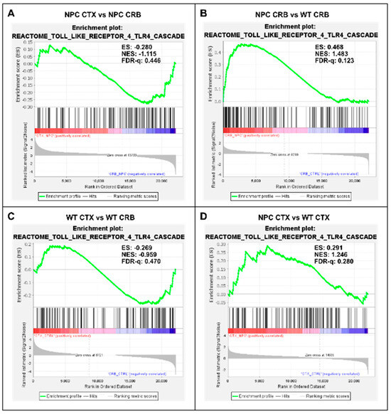 Gene set enrichment analysis of the Reactome Toll Like Receptor 4 (TLR4) pathway. Gene set enrichment analysis of the TLR4 signaling pathway shows no significant difference between tissues in Npc1−/− mice (A) or in wild-type controls (C). Notably, while TLR4 pathway gene set enrichment is significantly higher in the cerebellum of Npc1−/− mice compared to the cerebral cortex (B), no differences were found between tissues in the wildtype brain (D). ES = enrichment score; NES = normalized enrichment score; FDR-q = false discovery rate q value.