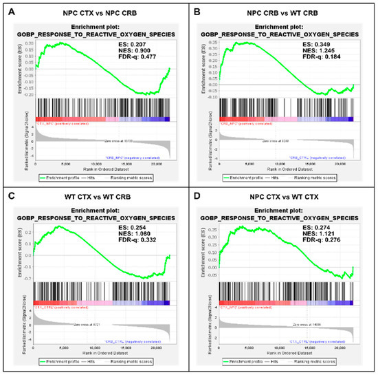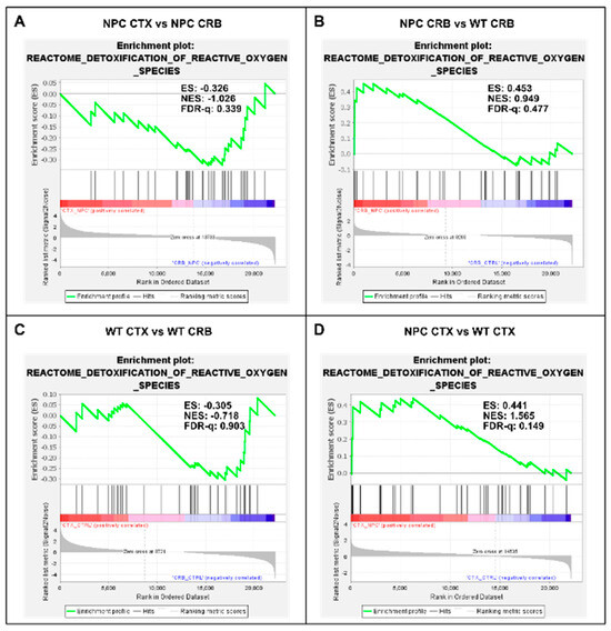 Because the excess DAMP generation leading to high levels of ROS and lipid peroxidation in the Npc1−/− brain [14,15,16,17] would be expected to induce an antioxidant response, we carried out enrichment analyses of the Gene Ontology Biological Process Response to Reactive Oxygen Species gene set, as well as the Reactome Detoxification of Reactive Oxygen Species gene set, to measure relative differences in the activation of responses to ROS in Npc1−/− and wildtype mice. The former gene set highlights the presence of a wide range of functional changes as a result of a reactive oxygen species stimulus, such as the predicted oxidative environment in the Npc1−/− cerebellum (https://www.gsea-msigdb.org/gsea/msigdb/mouse/geneset/GOBP_RESPONSE_TO_REACTIVE_OXYGEN_SPECIES.html; accessed on 6 January 2024). By contrast, the Detoxification of Reactive Oxygen Species gene set includes genes corresponding to detoxifying enzymes, such as different glutathione peroxidases and superoxide dismutases (https://www.gsea-msigdb.org/gsea/msigdb/mouse/geneset/REACTOME_DETOXIFICATION_OF_REACTIVE_OXYGEN_SPECIES.html; accessed on 6 January 2024). As shown in Figure 5, the Response to Reactive Oxygen Species gene set was not different between the cerebral cortex and cerebellum, either in Npc1−/− mice (Figure 5A; FDR-q = 0.477) or in wildtype controls (Figure 5C; FDR-q = 0.332). Comparisons between genotypes revealed gene set enrichment in the cerebellum of Npc1−/− mice versus wildtype controls (Figure 5B; FDR-q = 0.184) but not in the cerebral cortex (Figure 5D; FDR-q = 0.276), which is consistent with the presence of higher ROS levels in the cerebellum of Npc1−/− mice. On the other hand, GSEA of the Reactome Detoxification of Reactive Oxygen Species set revealed enrichment only in the cerebral cortex of Npc1−/− mice compared to wildtype controls (Figure 6D; FDR-q = 0.149), suggesting an impaired detoxifying response to the oxidative stress environment of the NPC cerebellum.