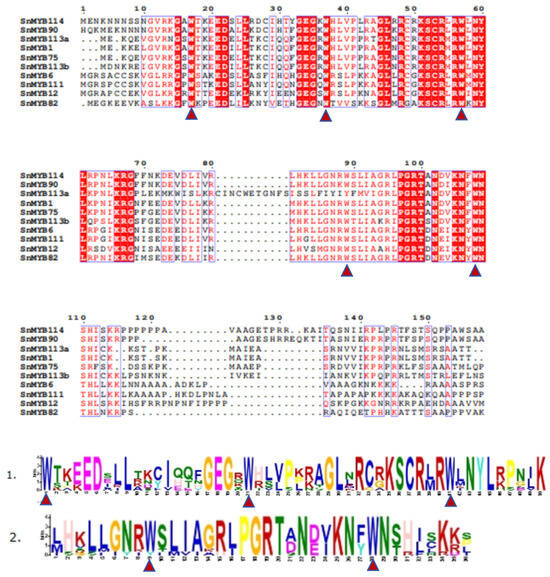 Predicted R2 and R3 domains of candidate S. nemorosa MYB proteins and their sequence logos. The bit score serves as a measure of the information content at each position within the sequence, while the red triangle below denotes the conserved tryptophan residues (Trp, W).