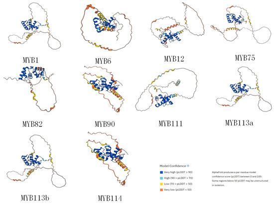 In order to investigate the preservation of the sequence, an analysis was conducted. A prior investigation revealed that the distinctive feature of the MYB domain was a series of evenly spaced and strongly conserved tryptophan residues (W), consistent with the patterns of R2 [-W-(X19)-W-(X18/19)-W-] and R3 [-F/L-(X18)-W-(X18)-W-] repeats [40]. As we observed, the sequence alignment illustrated that the conserved residues Trp17, Trp37, and Trp57 in the R2 domain and Trp89 and Trp108 in the R3 domain, as well as the peptide chain between them, to form a hydrophobic core (Figure 2). The MYB proteins were characterized by a highly conserved DNA-binding domain, comprising one to four helix–turn–helix (HTH) structures and functioning as tandem repeats referred to as R0R1R2R3 within an MYB protein [41]. Meanwhile, the R2 and R3 regions were made up of well-defined α-helices and β-turns further constituting a helix–turn–helix (HTH) structure [42]. To better understand the features of the DNA-binding regions of candidate SnMYB genes, we utilized AlphaFold to forecast the three-dimensional shapes of the proteins produced by 10 candidate genes (Figure 3). These structures were in accordance with the reported characteristics of typical plant R2R3-MYB proteins [43].