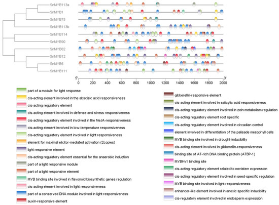 Moreover, cis-regulatory elements, acting as momentous molecular switches, were involved in the regulation of gene transcription when encountering external stimuli [59]. To illuminate the functions of SnMYB genes, six cellular-development-related cis-regulatory elements, seven hormone-related cis-regulatory elements, and thirteen stress-related cis-elements were identified in SnMYB promoter regions by analyzing cis-regulatory elements in the promoter regions. The ten SnMYB genes contained diverse types and vast quantities of cis-acting regulatory elements in each promoter region, such as elements involved in the MeJA-response, the salicylic acid response, the gibberellin response, the low-temperature response, and light response, as well as a drought-induced MYB-binding site, which have been reported to be involved in the processes of growth metabolism and environmental stress response [60,61].