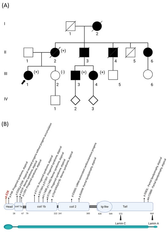 The family history was positive for multiple family members reported to have similar phenotypes, including her grandmother, mother, and uncles (Figure 1A). Her maternal grandmother (individual I.2) passed away at the age of 32, and an autopsy showed a heavily calcified mitral valve and aortic valve with friable verrucous vegetations on both valves. Genetic testing by Sanger DNA sequencing for a subset of genes associated with HGP was performed on some affected family members previously, which reported a variant of uncertain significance in LMNA NM_170707.2 c. 4G>A, p.(Glu2Lys). However, the proband was not included in this testing. She subsequently underwent clinical exome sequence analysis at the age of 35 by GeneDx, which reported the same LMNA variant. This variant was initially classified as a Variant of Uncertain Significance (VUS) because it was absent from the gnomAD database (PM2_supp), and in silico predictions indicated uncertainty (REVEL 0.35). To better assess the role of this variant and fulfill the ACMG criteria for functional studies, PS3 in vitro studies were conducted, as reported below [12]. The variant was further classified as likely pathogenic, supported by segregation studies (PP1_strong, PM2_supp, PP4, and PS3_supp).