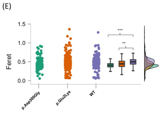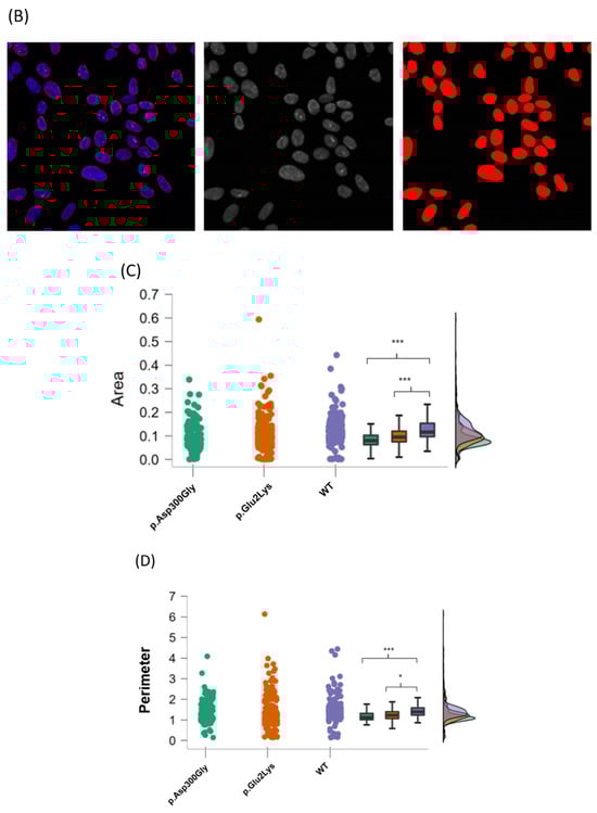 Additionally, nuclear images were analyzed with the ImageJ software (version 1.53v 21 November 2022) using three parameters: area, perimeter, and Feret’s diameter (also known as maximum caliper). In total, 175 nuclear objects from the p.Asp300Gly variant, 326 from the p.Glu2Lys variant, and 270 from WT nuclei were evaluated (Figure 2B).