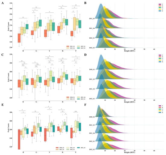 Three laboratories (LAB_b, LAB_c, and LAB_e) conducted routine detections using the VeriFiler™ Plus kit over multiple quarters. The signal quantities and height distributions of the five dyes in the negative samples are depicted in Figure 2. The results revealed significant differences in negative signal quantities for these labs during the 2021_S3, 2022_S1, and 2021_S4 quarters compared with the other quarters. However, these disparities in signal height distribution did not align perfectly with the signal quantities. In the 2021_S3 quarter, LAB_b exhibited a higher average signal height than in the 2021_S4 and 2022_S1 quarters. LAB_e displayed a markedly lower average signal height for various dyes in the 2020_S2 quarter, in contrast to the other quarters, where the signal height showed no significant differences. LAB_c did not exhibit substantial differences in signal height across the four quarters analyzed. The analysis using the AGCU EX22 kit focused exclusively on LAB_a over 12 quarters (Figure S1). Significant differences in signal quantities were noted among various quarters, particularly in the 2021_S4, 2022_S1, and 2022_S3 quarters, compared with several other quarters in which significant differences in signal quantities were infrequent or relatively weak (0.01 < p ≤ 0.05). However, the highest average signal heights were observed in the 2020_S2 and 2020_S3 quarters, with maximum signal heights exceeding 40 RFU. Analysis using the PowerPlex® 21 System kit included results from four laboratories (LAB_c, LAB_d, LAB_e, and LAB_f) (Figure S2). Similar to the previous two kits, varying degrees of differences in negative signal quantities were observed across the different quarters. Notably, these differences seemed to occur randomly, and no regular patterns were observed. Furthermore, the disparity in the results for different dyes varied slightly. Additionally, the differences observed in the signal quantities did not parallel the variations in the signal height distribution. Occasional disparities in height distribution are inevitably poised to exert varying degrees of influence on the exploration of potential information below the AT.