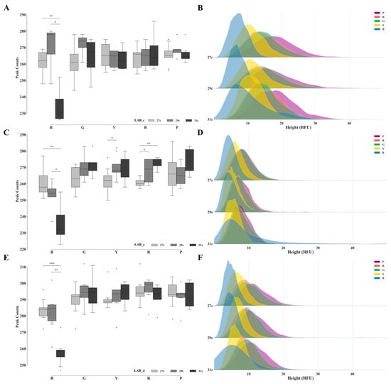 The signal quantities and height distributions in negative samples detected under PCR cycle numbers of 27, 29, and 31, utilizing the VeriFiler™ Plus kit. Sub-figures (A,C,E) display the signal quantities for LAB_c, LAB_e, and LAB_d, respectively, while sub-figures (B,D,F) showcase the corresponding signal height distributions. The outliers are represented by diamonds. Statistical significance is indicated by symbols: * denotes 0.01 < p ≤ 0.05, ** denotes 0.001 < p ≤ 0.01, *** denotes 0.0001 < p ≤ 0.001.
