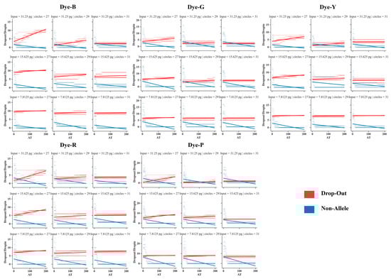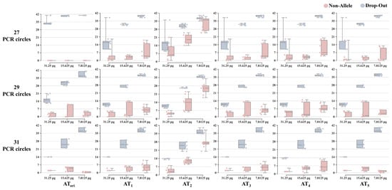 When the AT was systematically adjusted from 1 to 200 RFU, the analysis of control DNA 9947A exhibited variations in allelic dropouts and non-allelic peaks across different PCR cycle numbers and template inputs for each dye (Figure 5 and Figures S5–S10). Despite these discrepancies, consistent patterns emerged: allelic dropouts increased with higher ATs, whereas non-allelic peaks decreased under similar conditions. This trend was clear and easy to understand. Specifically, as the number of PCR cycles was increased at the same AT, there was a noticeable reduction in allelic dropouts. Higher ATs led to a gradual flattening of the growth trend of allele dropouts, reaching the lowest achievable level for individual dyes. This stabilization indicated that a certain allele was either completely absent or at an equivalent level to the baseline, rendering detection impossible. For instance, in LAB_a, with a DNA input of 31.25 pg for 9947A, the results for the blue dye indicated that under 27, 29, and 31 PCR cycles, the average numbers of allele dropouts were 4, 2.7, and 2, respectively. Under 31 PCR cycles, the number of allele dropouts remained at the lowest level of 2, despite the increasing AT. Conversely, as the DNA template input decreased under the same AT, allelic dropout increased. Similar to the trend observed with increasing number of PCR cycles, higher ATs led to a gradual flattening of the growth trend of allele dropouts. For example, under 27 PCR cycles and DNA inputs of 31.25 pg, 16.625, and 7.8125 pg, the average numbers of allele dropouts in the blue dye were 4, 9.7, and 9.9, respectively. Furthermore, when the PCR cycle numbers were increased or the DNA template input was reduced, the reduction in the quantity of non-allelic peaks with higher ATs was not significantly pronounced.