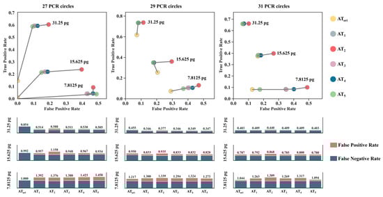 Figure 7 shows a ROC plot comparing the true-positive and false-positive rates of the results analyzed at six analytical threshold settings. Ideally, the analysis should have a false-positive rate of 0 and a true-positive rate of 1, indicating good performance. Thus, the point closest to the top-left corner represents the optimal method for minimizing Type I and Type II error rates []. Figure 7 illustrates the high Type I error rates that occurred when AT2 was used because of the erroneous labeling of non-allelic signals. In contrast, ATori led to low Type I error rates, whereas high thresholds resulted in a high incidence of Type II errors. For DNA template amounts of 31.25 pg or 15.625 pg, irrespective of the number of cycles, AT5 demonstrated certain advantages, as indicated by the ROC curve. However, when the template amount was extremely low (7.8125 pg), the optimal AT was not discernible from the ROC curve. Considering the total error rate as the sum of false negatives and false positives under all PCR cycles, using ATori with a DNA template amount of 7.8125 pg yielded the lowest total error rate, resulting in total error rates of 1.000, 1.217, and 1.044, respectively.