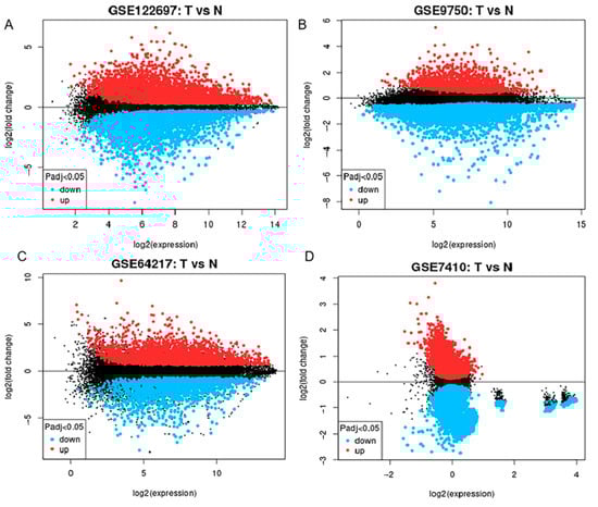 Displays a volcano map representing the csc anomaly dataset. This map contains four data sets: (A) GSE122697, (B) GSE9750, (C) GSE64217, and (D) GSE7410. In this map, the red color indicates genes that are upregulated as determined by log fold change (log FC) >1.0 and adjusted p-value < 0.05. Genes shown in black are downregulated and meet the criteria of log FC less than −1.0 and adjusted p-value less than 0.05. “T” represents samples from cervical cancer, and “N” represents samples from normal subjects.