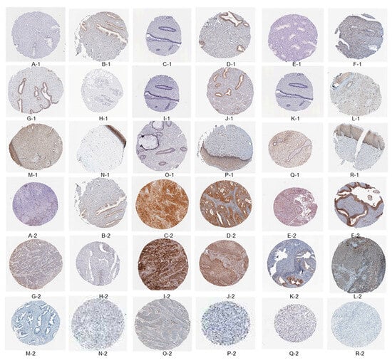 Figure 3A,B display data obtained from the HPA library, showcasing a comparison between the cervix of healthy females and those with cervical cancer. In contrast to the normal cervical tissue, cancerous cells exhibited notable differences, including an increased cell count, significantly enlarged nuclei, hyperchromatic nuclei, a noticeable enhancement in chromatin staining intensity and thickness, and a distinctive bluish-purple droplet-like feature. These observations indicate a highly malignant and proliferative state of the cancer cells.