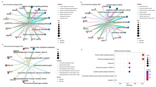 We employed the “gene MANIA” tool to construct a set of 22 genes related to CXCL8 and CXCL10. The protein–protein interaction (PPI) and co-expression network exhibited a total of 1423 connections, as depicted in Figure 7A. The gene ontology analysis of this network unveiled that these 22 genes were predominantly enriched in seven distinct biological processes, seven cellular components, and seven molecular functions, as illustrated in Figure 7B–D. Notably, CXCL8 and CXCL10, playing significant roles in immune function, may participate in the “chemokine mediated signaling pathway” and exhibit “chemokine activity”. Moreover, they could be associated with the “external side of plasma membrane”, suggesting substantial alterations in the outer plasma membrane, potentially contributing to the pathogenesis of CESC patients.