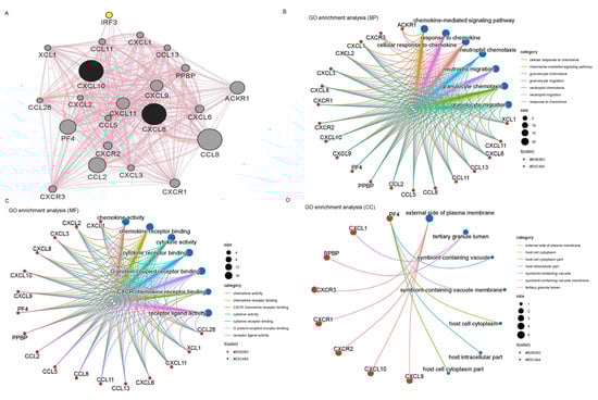 Putative CXCL8 and CXCL10 PPI networks and GO analysis. (A) Co-expression and PPI network. (B) Bioprocess. (C) Cellular components. (D) Molecular function.