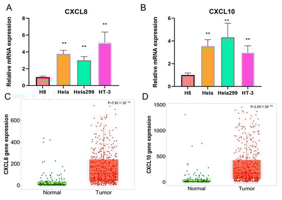 We employed RT-PCR to ascertain the mRNA expression levels of CXCL8 and CXCL10 in human cell lines derived from cervical cancer. In comparison to H8 (representing normal cervical cells), we observed a significant increase in CXCL8 and CXCL10 levels within the HeLa, hela299, and ht-3 cell lines (all being cervical cancer cells) (p < 0.01) (as shown in Figure 8A,B). Furthermore, this phenomenon was validated by analyzing the expression of CXCL8 and CXCL10 in both normal and cervical cancer tissues (as depicted in Figure 8C,D).