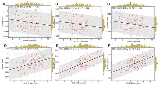 Interestingly, we observed a noteworthy correlation between the expression levels of the CXCL8 and CXCL10 genes and the stromal score, immune score, and evaluation score in patients with CESC (see Figure 9). The tumor microenvironment is paramount for both tumor formation and progression []. The estimation algorithm utilizes an enrichment analysis on the gene set of the target sample, yielding three distinct scores: the matrix score, immune score, and estimation score. These scores aid in the analysis of the tumor tissue matrix, the assessment of immune cell infiltration, and the inference of tumor purity, respectively [].