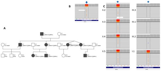 After interviewing the patient, it was determined that other family members also presented clinical abnormalities (the proband’s father and three of the proband’s siblings); thus, they underwent a detailed clinical evaluation. The presence of scoliosis, camptodactyly and other deviations was confirmed. All the aforementioned family members were referred for genetic testing. Three of the proband’s children, who do not present characteristic phenotypic features, also underwent additional genetic testing. Initially, no genetic testing was performed on the children of the remaining siblings of the proband. Recently, genetic testing was performed on three children of the proband’s sisters (III.4, III.5, III.7) who have similar clinical symptoms.