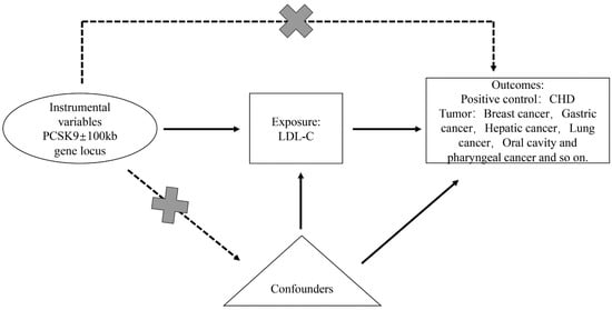 Based on Mendelian randomization two-sample analysis, we investigated the causal relationship between single nucleotide polymorphisms (SNPs) within ±100 kb of the PCSK9 gene locus, which is closely associated with low-density lipoprotein cholesterol (LDL-C) and various malignant tumors (breast cancer, lung cancer, gastric cancer, hepatic cancer, oral cavity and pharyngeal cancer, carcinoma in situ of the cervix uteri, bladder cancer, thyroid cancer, pancreatic cancer, colorectal cancer, malignant tumors of the kidney excluding the renal pelvis, malignant brain tumors, and esophageal malignant tumors). Mendelian randomization utilizes genetic variants as proxies for risk factors; hence, effective instrumental variables (IVs) in causal inference must satisfy three key assumptions: (1) genetic variants are directly associated with exposure; (2) genetic variants are unrelated to confounding factors that might exist between exposure and outcome; (3) genetic variants do not affect the outcome through pathways other than exposure (Figure 1).