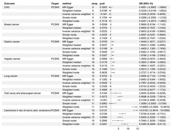 Mendelian randomization analysis results for drug targets. The causal relationship between PCSK9 inhibitors and CHD, breast cancer, gastric cancer, hepatic cancer, lung cancer, oral cavity and pharyngeal cancer, and carcinoma in situ of the cervix uteri and endocervix. nsnp, number of nucleotide polymorphisms; OR, odds ratio; CI, confidence interval.