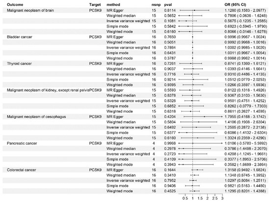 Mendelian randomization analysis results for drug targets. The causal relationship between PCSK9 inhibitors and bladder cancer, thyroid cancer, pancreatic cancer, colorectal cancer, and malignant tumors of the brain, kidney (except for renal pelvis tumors), and esophagus.