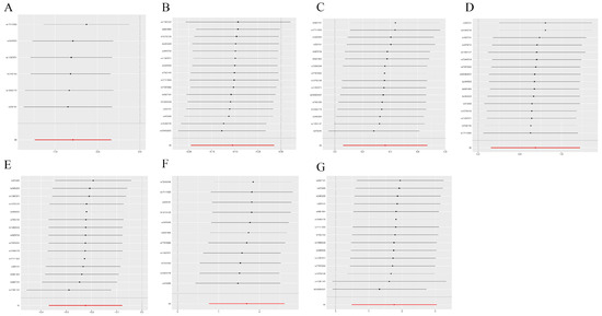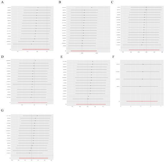Sensitivity analysis. If the comprehensive effect of the remaining SNPs is consistent with the main effect after removing one SNP. (A) Malignant neoplasm of brain, (B) Bladder cancer, (C) Thyroid cancer, (D) Malignant neoplasm of kidney, except renal pelvis, (E) Malignant neoplasm of esophagus, (F) Pancreatic cancer, (G) Colorectal cancer.
