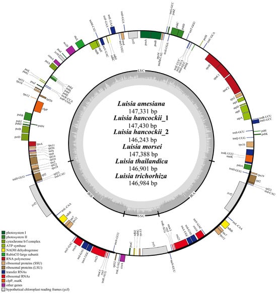 Plastid genome annotation maps of Luisia amesiana, Luisia hancockii, Luisia hancockii (OR030420), Luisia morsei, Luisia thailandica and Luisia trichorhiza. The deeper shade in the inner circle reflects the GC content. The IRA and IRB, LSC, and SSC are highlighted external to the GC content.
