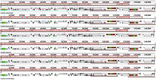 A total of five Luisia plastomes were newly reported and compared with the previously reported plastome of L. hancockii_2 (OR030420). All Luisia plastomes possess the typical quadripartite structure of angiosperm plastomes, consisting of a pair of IRs ranging from 25,195 to 25,460 bp, separated by the LSC (85,208–85,953 bp) and SSC (10,195–11,412 bp) regions (Figure 1). The plastome size (ranging from 146,243 to 147,430 bp) and GC content (36.6%) were similar to those observed in other Orchidaceae lineages [47,48]. Additionally, there were no rearrangements among Luisia plastomes detected by the collinearity analysis (Figure 2). These findings suggest a high degree of conservation among the six Luisia plastomes, concerning genome size, GC content, and gene order.