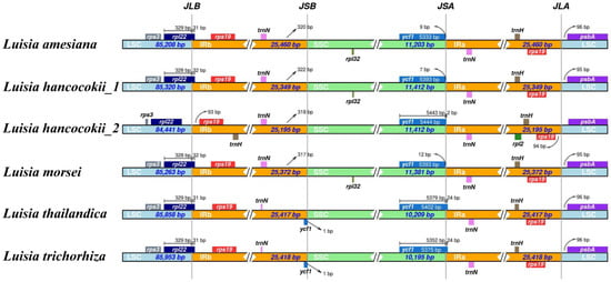 Comparative analysis of boundaries between the LSC, SSC, and IR regions among six Luisia plastomes.