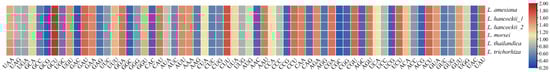 The analysis of codon usage frequency in Luisia plastomes utilized the concatenated matrices of 68 CDSs, excluding the ndh genes due to loss and pseudogenization. These CDSs were encoded by a varying range of codons, from 19,305 (L. trichorhiza) to 19,383 (L. morsei) (Supplementary Table S4). The analysis of codon usage patterns revealed a notably conserved codon usage bias (CUB) across the plastomes of the six Luisia species (Figure 4, Supplementary Table S4). Leu had the highest frequency among the amino acids, while Cys had the lowest frequency (Supplementary Table S4). Analysis of the relative synonymous codon usage (RSCU) showed that GCU had the highest value, averaging 1.872, while CGC exhibited the lowest average value (0.347). The highest RSCU values within the three termination codons (UAA, UAG, UGA) were observed for UAA, with a range from 1.368 to 1.500.