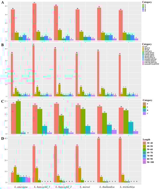 Different types of SSR and long repeats were examined to clarify intragenus variations. Firstly, six types of SSR were examined in Luisia plastomes, revealing a total of 57 SSRs in L. amesiana to 64 SSRs in L. hancockii_1 (Figure 5, Supplementary Table S2). Mononucleotide repeats were the most frequent type [35,36,37,38,39,40,41,42,43], followed by dinucleotide repeats [9,10,11,12]. Hexanucleotide repeats were not detected in all Luisia plastomes. Additionally, it was observed that only A/T repeats [36,37,38,39,40,41,42,43] were detected in mononucleotide repeats.