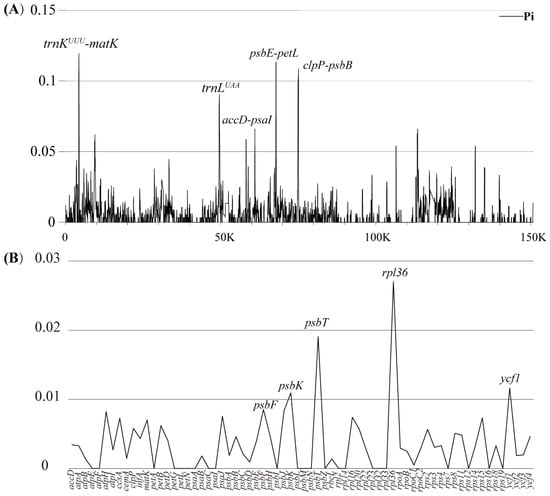 Nucleotide variability values (Pi) of six Luisia plastomes. (A) Pi values for the whole plastome with annotations indicating five mutation hotspot regions. (B) Pi values for 68 CDSs. The window size was configured at 100 bp, and the sliding windows size was set to 25 bp.