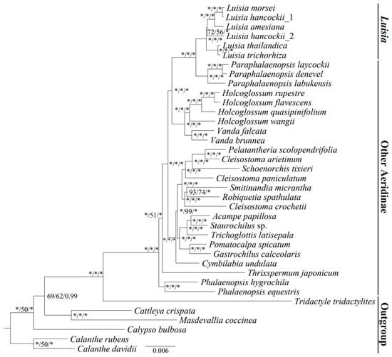 Taxonomically, distinguishing and identifying Luisia species constitutes a significant challenge, due to the scarcity of distinct morphological characters among different species, making this genus a problematic taxonomic group [5]. Morphologically, Seidenfaden indicated that floral size was considered important evidence within Luisia [6]. Molecular phylogenetics, however, revealed that the phylogenetic relationships were inconsistent with the taxonomy based on floral size [7]. Additionally, the intrageneric relationships of Luisia, based on one of few traditional DNA sequences, commonly revealed unstable topologies with weak to moderate support [8,9]. These results showed that morphological evidence and a small number of traditional molecular markers are not sufficient for the classification of Luisia. Therefore, the comprehension of the phylogenetically recalcitrant group remains rudimentary.