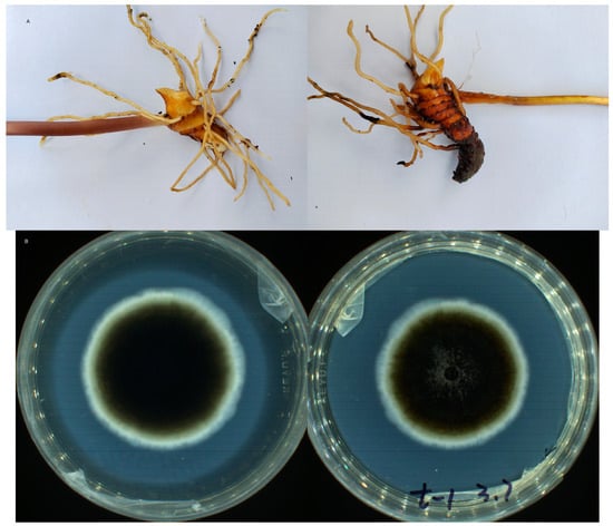 After washing the roots of the diseased plant with distilled water, they were naturally dried. The blade was disinfected with 75% ethanol and the samples were cut into 5 mm thin slices. The sample was soaked in 2% sodium hypochlorite for 3 min, followed by 75% ethanol for 30 s, and rinsed repeatedly with sterile water three to four times. Then, the diseased samples were placed on a PDA medium including 0.1% streptomycin and cultured at 28 °C for 3–5 days. Next, after the diameter of the colony reached 2–3 cm, a small amount of mycelium was taken from the edge of the colony and placed in the center of the PDA culture medium. The pure colony was obtained after incubation at 28 °C for 48 to 72 h, and the strain was transferred to a PDA tube. The mycelium was stored in a refrigerator at 4 °C.