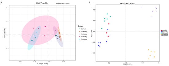 The principal co-ordinates analysis (PCoA) pairwise comparisons of microbial communities in root rot diseased and healthy P. polyphylla. (A) Bacterial PCoA; (B) fungal PCoA. S. Blank: blank control for soil samples; S. Healthy: healthy control for soil samples; S. Disease: diseased soil samples; R. Healthy: healthy control for rhizome samples; R. Disease: diseased rhizome samples.