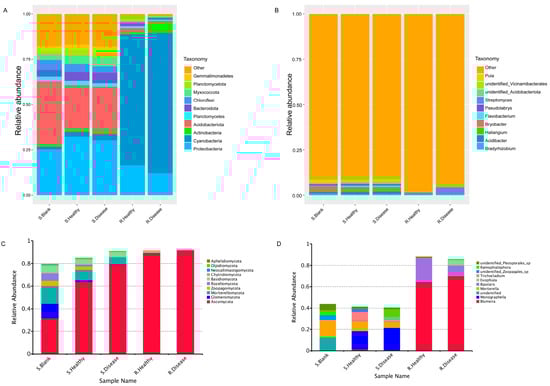 Relative abundance (%) plots of the microbial communities of root rot diseased and healthy P. polyphylla. The top 10 most abundant bacteria at the phylum level (A) and genus level (B) are represented. The top 10 most abundant fungi at the phylum level (C) and genus level (D) are represented.