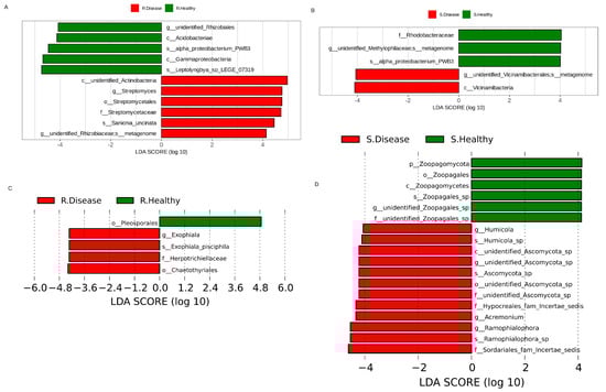 The linear discriminant analysis effect size (LEfSe) was used to find the bacterial biomarkers with significant differences between the healthy and diseased P. polyphylla (Figure 5). There were 11 bacterial biomarkers found in R. Healthy vs. R. Disease, including Acidobacteriae, Gammaproteobacteria, unidentified_Rhizobiales, Streptomyces and Proteobacterium. Five bacterial biomarkers were found in S. Healthy vs. S. Disease, including Proteobacterium, Rhodobacteraceae and Vicinamibacteria (Figure 5A). The results showed that five fungal biomarkers were found in R. Healthy vs. R. Disease, including Ascomycota, Gammaproteobacteria, Streptomyces and Proteobacterium. Eleven fungal biomarkers were found in S. Healthy vs. S. Disease, including Zoopagomycota, Zoopagales, Zoopagomycetes, Humicola, Ascomycota and Acremonium. Furthermore, the top 10 differentially abundant bacterial genera and species are shown in Table 1. The genera include unidentified_Rhizobiales, Lysinibacillus, Anaeromyxobacter and Halomonas and the species include unidentified_Rhodospirillaceae, Pirellula, unidentified_Chloroflexi, unidentified_Alphaproteobacteria, Ferruginibacter and Luteitalea.