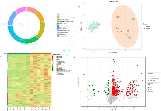 Differentially accumulated metabolites in healthy and diseased P. polyphylla. (A) Circular graph for metabolite classes; (B) principal component analysis (PCA) analysis pairwise comparisons of differential metabolites; (C) heatmap of accumulated metabolites; (D) volcano plots for differentially accumulated metabolites.