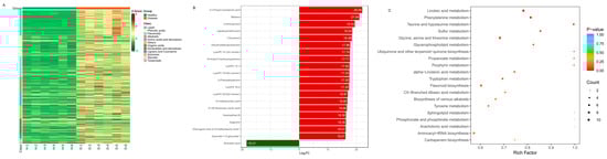The most significantly differentially accumulated metabolites in healthy and diseased P. polyphylla. (A) Heatmap of differentially accumulated metabolites; (B) top 20 differentially accumulated metabolites; (C) KEGG pathway enrichment (A–C) of differentially accumulated metabolites.