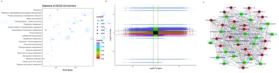 KEGG pathway enrichment of DEGs and nine-quadrant plot. (A) KEGG analysis of DEGs; (B) nine-quadrant plot. (C) Network diagram between DEGs and DAMs. Metabolites are shown in green squares and genes are shown in red circles. The solid line represents the positive correlation and the dashed line represents the negative correlation.